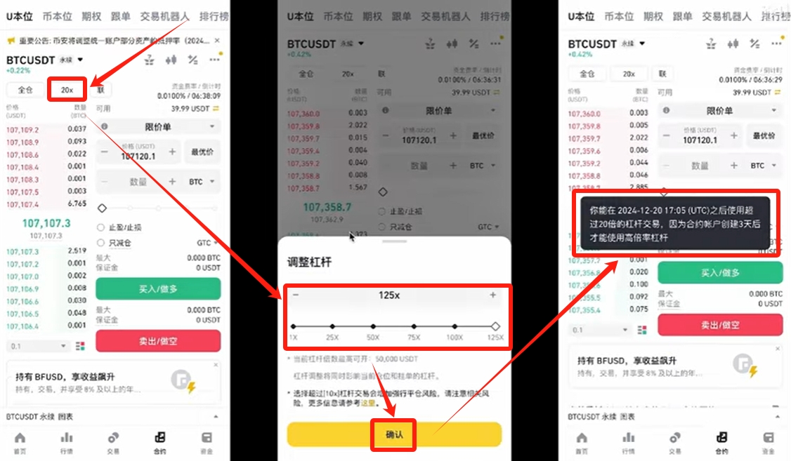 新开通的合约账户需经历72小时冷却期才能使用高倍杠杆。建议提前完成开通流程,注意125倍杠杆属于高风险操作,需充分理解强制平仓机制。