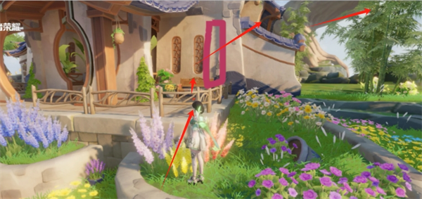 1、首先我们来到房子右边的墙角处,先跳上墙角的椅子背上,然后一直往上跳,往右一点卡跳上小屋檐上
