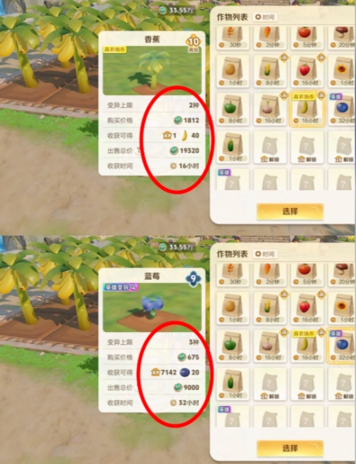 2、蓝莓是农场经验高,但是成长周期较长(32小时)