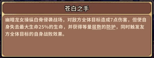 该流派对资源投入要求较高,新手期成型难度较大,更适合中后期拥有稳定养成资源的玩家构筑。其核心启动角色为白龙女(又称幽暗龙女),其主动技能“苍白之手”可对敌方全体造成7点固定伤害,同时消耗自身25%当前生命值;生命值归零后,将立即获得等量层数的防护效果,并为全体友方施加“战败”状态。该状态是整个遗言流运转的基石,所有后续增益均依赖其稳定触发。