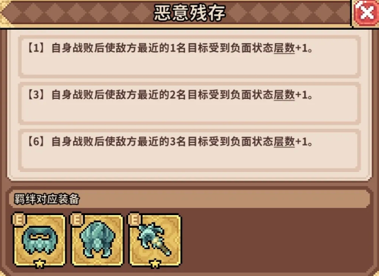 当白龙女释放大招后,“战败”状态将激活多重联动:包括装备特效、支援位加成及天赋被动的强化反馈。因此,实现每回合稳定触发战败,是该流派成型的关键门槛。在装备选择上,推荐优先成型“邪神套”。该套装的核心被动“恶意残存”,可在角色触发战败后,为目标最近单位附加负面状态层数;且随套装件数提升,受影响敌方目标数量同步增加——满配时可覆盖敌方三名单位,持续加深负面层数。