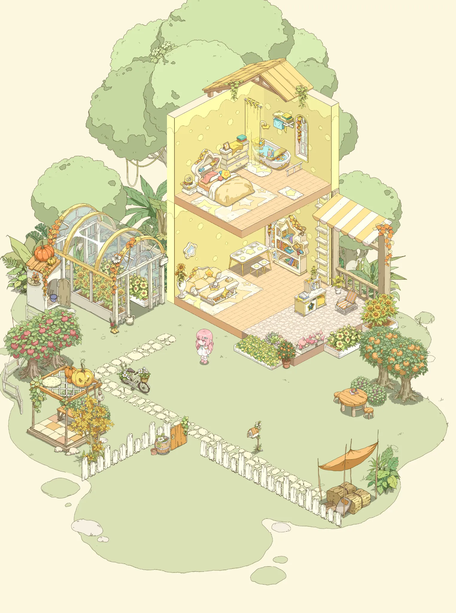家园建设是另一大支柱玩法。游戏提供高度开放的室内装修系统,所有家具与装饰物均需通过花材转化获得,不存在绑定抽卡或限时获取机制。布局完全由玩家自主决定,从墙面配色到家具朝向,均可自由调整,真正实现“所想即所得”的个性化空间构建。