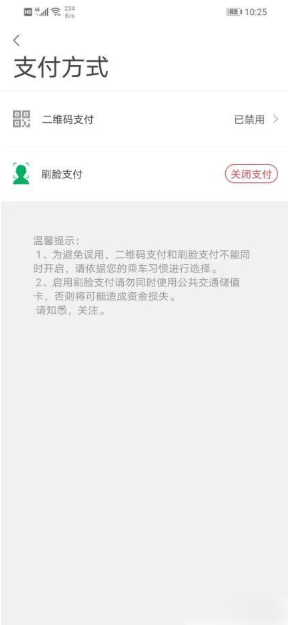 4.一应黔行APP现有2种乘车支付方式:乘车码、刷脸支付,在“支付方式”页面用户可以选择具体的支付方式。支付方式可以在未发生乘车行为时随时切换,但同一时间只能选择其中一种,另外一种将会被暂时禁用。若开通了刷脸支付的同时,用户使用单程票、储值卡或其他APP乘车码等方式进闸,将会导致重复扣费,请避免。