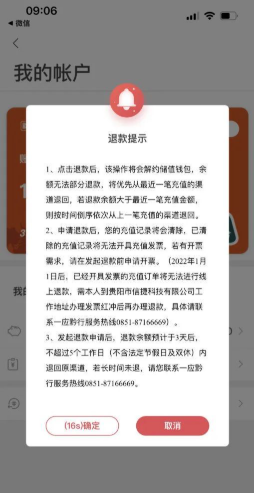 5.储值账户(钱包)内余额退款:进入“我的账户”页面,点击退款,阅读退款提示,点击“确认”则申请退款成功。注:发起退款申请后,退款余额预计于3天后不超过5个工作日(不含法定节假日及双休)内退回原渠道,若长时间未退,请您联系一应黔行服务热线0851-87166669。