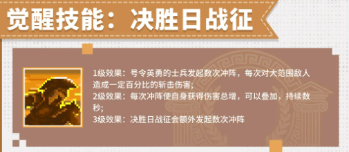 「决胜日战征」以高频次群体突袭为核心设计逻辑。技能释放后召唤士兵发起冲锋,对路径及终点区域敌人造成范围斩击伤害;升至二阶时,每次冲锋可为自身叠加持续数秒的伤害总增效果,且该增益支持多层叠加;三阶进一步拓展战术维度,允许单次技能触发多次连续冲锋,显著提升单位时间内的爆发输出密度。整体技能节奏强调“重复施放—持续增益—集中清场”的循环链路,与圣魂系统的联动空间广阔。