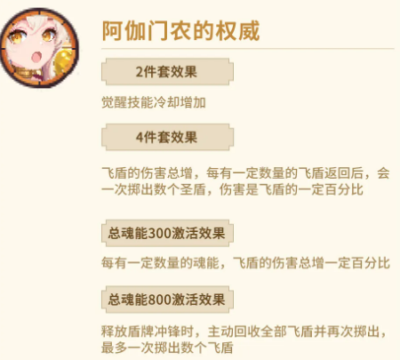 「阿伽门农的权威」聚焦飞盾体系深度开发。两件套缩短「决胜日战征」冷却时间,提升技能使用频率;四件套增强飞盾基础伤害,并设定飞盾返程数量阈值——达标后立即掷出多枚圣盾,其伤害为当前飞盾伤害的固定百分比。当魂能达300点时,每累积指定量飞盾伤害,即触发飞盾伤害总增;魂能达到800点后,释放盾牌冲锋可主动召回全部在场飞盾并重新投掷,单次最多生成多枚飞盾,形成高密度爆发窗口。此套适合偏好中距离精准打击与节奏掌控的玩家。