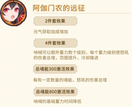 「阿伽门农的远征」围绕怒吼类技能构建蓄力生态。两件套提升元气获取效率,缓解前期资源压力;四件套扩展呐喊蓄力等级上限,每增加一级蓄力,怒吼的基础伤害、作用半径及冷却缩减均同步提升。魂能300点激活怒吼伤害总增;魂能800点效果暂未公开详细参数,但整体设计导向明确——通过延长蓄力时间换取更高强度的单次爆发,适合倾向节奏沉稳、追求高容错输出的战斗风格。