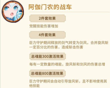 「阿伽门农的战车」强化近战连携体系。两件套直接提升「决胜日战征」基础伤害,提供最直观的数值加成;四件套实现剑气与旋风斩的机制融合——在巨力守护状态下释放的剑气将转化为剑风,并自动汇入旋风斩攻击范围,共同触发斩击伤害。魂能300点提升旋风斩与剑风的伤害总增;魂能800点解锁核心机制:巨力守护期间自动引导持续旋风斩,且不占用技能栏位,同时降低呐喊的基础蓄力时间。该套为贴身压制型打法提供完整支撑,兼具视觉表现力与实战压制力。