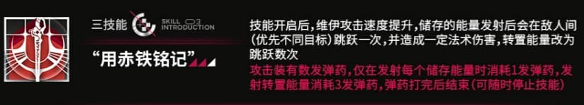 4.三技能「用赤铁铭记」是弹药技能,共27发弹药,攻速提升幅度很大,推测加200,差不多1秒一个球。攒的普通球发射后,会在敌人之间跳跃一次,转置能量则会跳跃更多次,推测大概弹5次。发射一个储存能量,消耗1发弹药,发射转置能量消耗3发。演示场景是伦蒂尼姆城防自行炮和萨卡兹战士,综合算下来,对群大概10万出头,但对单弹射的话,应该能到15万以上,具体数字,因为演示敌人血量太少,还不太好完全确认。