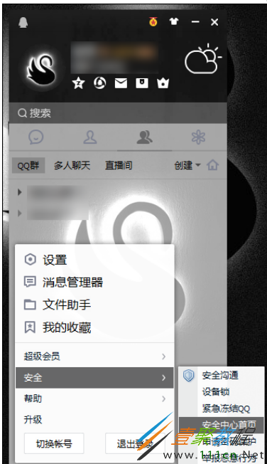 1、在电脑上登录QQ,然后点击主面板底部的主菜单,选择安全——安全中心首页;