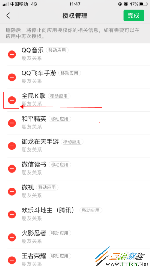 在滑出的菜单中,点击“删除”,然后点击右上角的“完成”,即可完成授权登录的删除,如下图所示