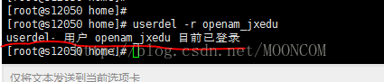 问题描述:我在root用户下,使用userdel -r openam_jxedu 指令删除该用户,但是却发现报如下错误。