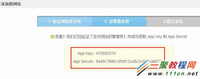 然后 点击 “开始接入”按钮,进入到 “添加新网站”,按页面提示填写相关信息。完成后,全马上显示 App ID 和 Secret KEY,如下图: